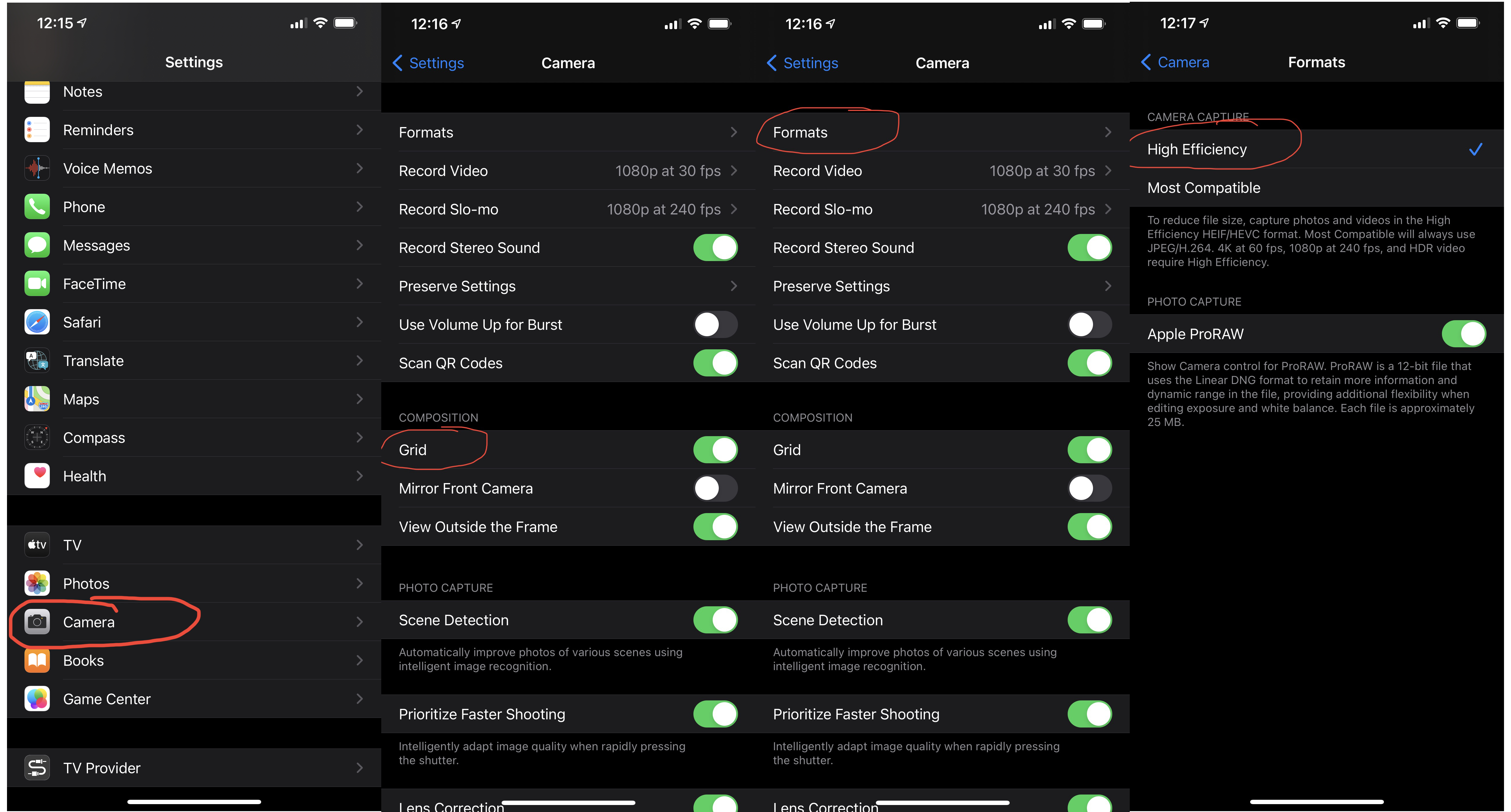 iPhone settings are pretty easy to work with. The main settings we want to change are the camera’s quality and turning on the grid, which can be seen in the photo. The main reason we want the grid is so that our photos will come out straight and make it easier for us to use. If you want more details about other camera settings check out this article.