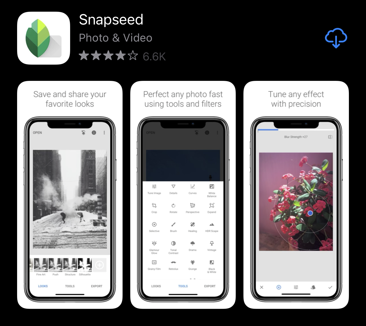The final app that I recommend is Snapseed, this is a combination of Lightroom and Photoshop in one app. Overall, it is a great easy to use app.