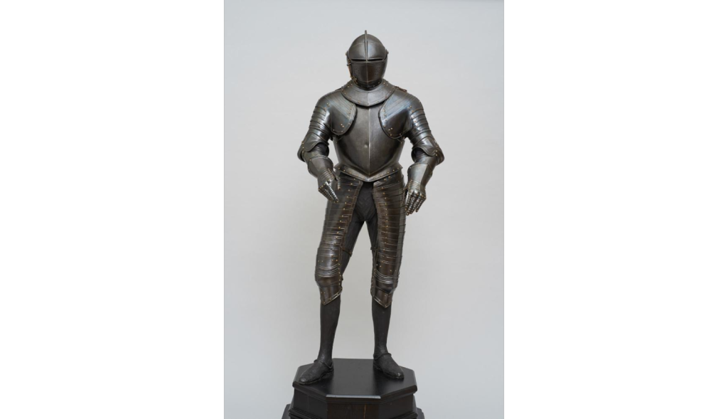 A personal favorite of mine, this piece of armor is held in the Philadelphia Museum of Art. It is this perfect mix of function and flair, where one does not subtract from the other. With gilded accents on the comb (top of the helmet) down to the sabaton (the bottom-most section of the armor) and beautiful and simplistic patterned textiles on the torso, this German-made piece is one of the most modestly notable pieces of armor, not due to extravagance, but selective balance. Photo credits