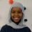 Image of Ayo Edebiri speaking into a microphone at a panel discussion / interview. Seated next to flowers.