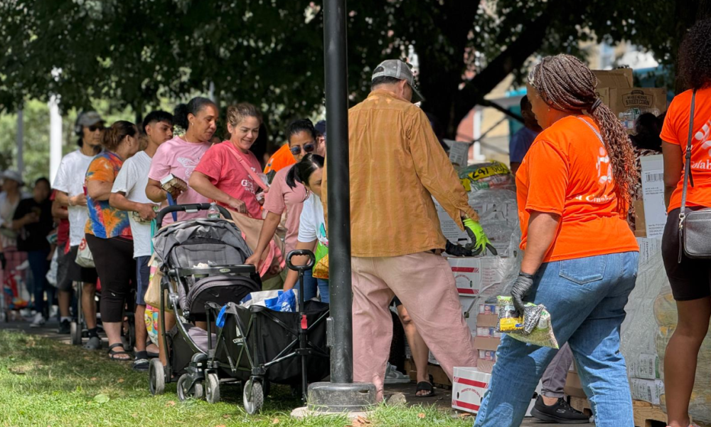 With beaming smiles and dressed in bright orange La Colaborativa shirts, a group of staff members hand out bags filled with potatoes, bread, and other essential groceries. As the line progresses, the staff passes out blue flyers packed with resources for housing, healthcare, legal aid and more. Each one is a small lifeline for the families gathered there.