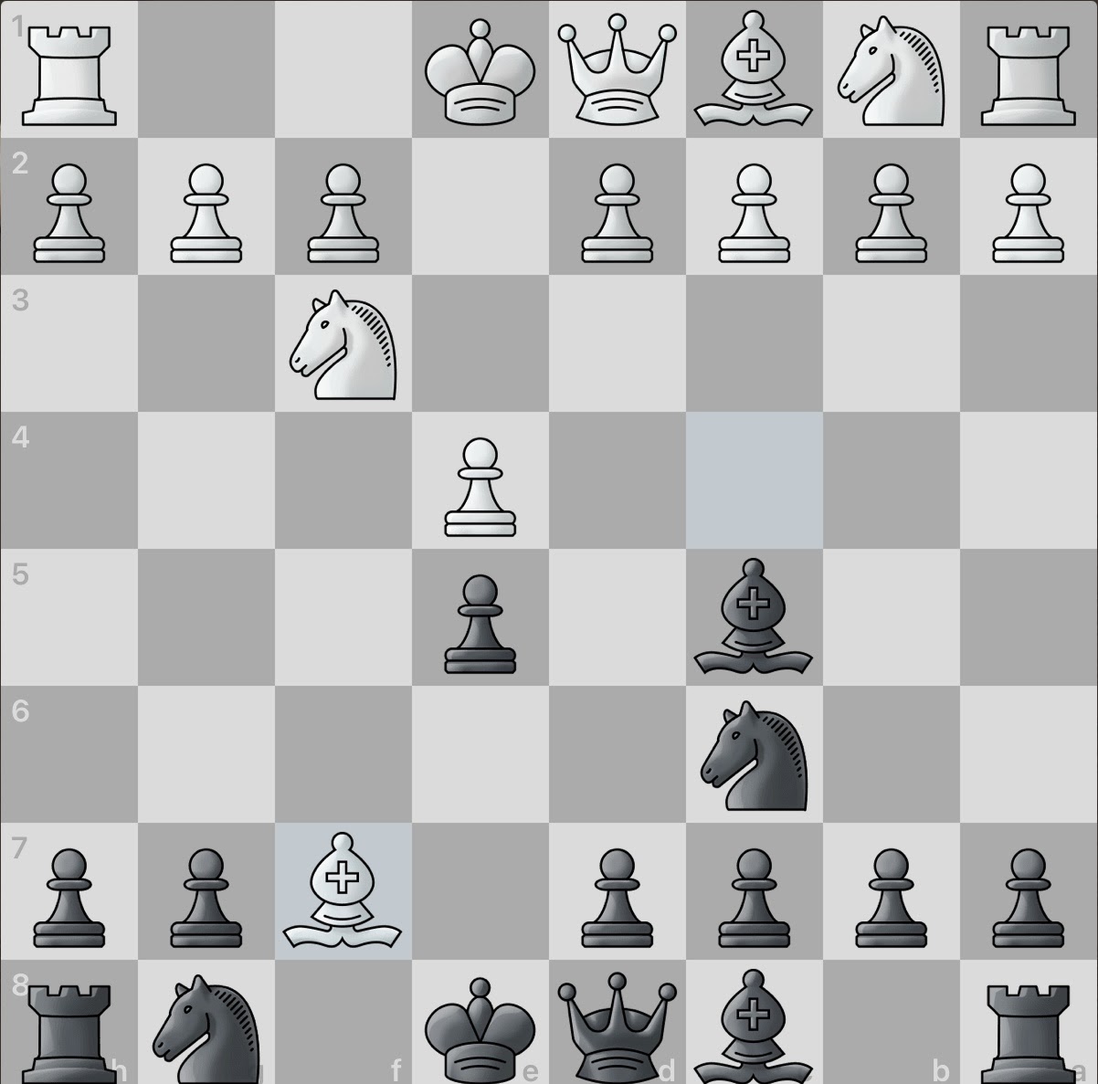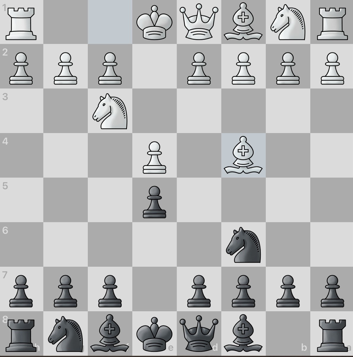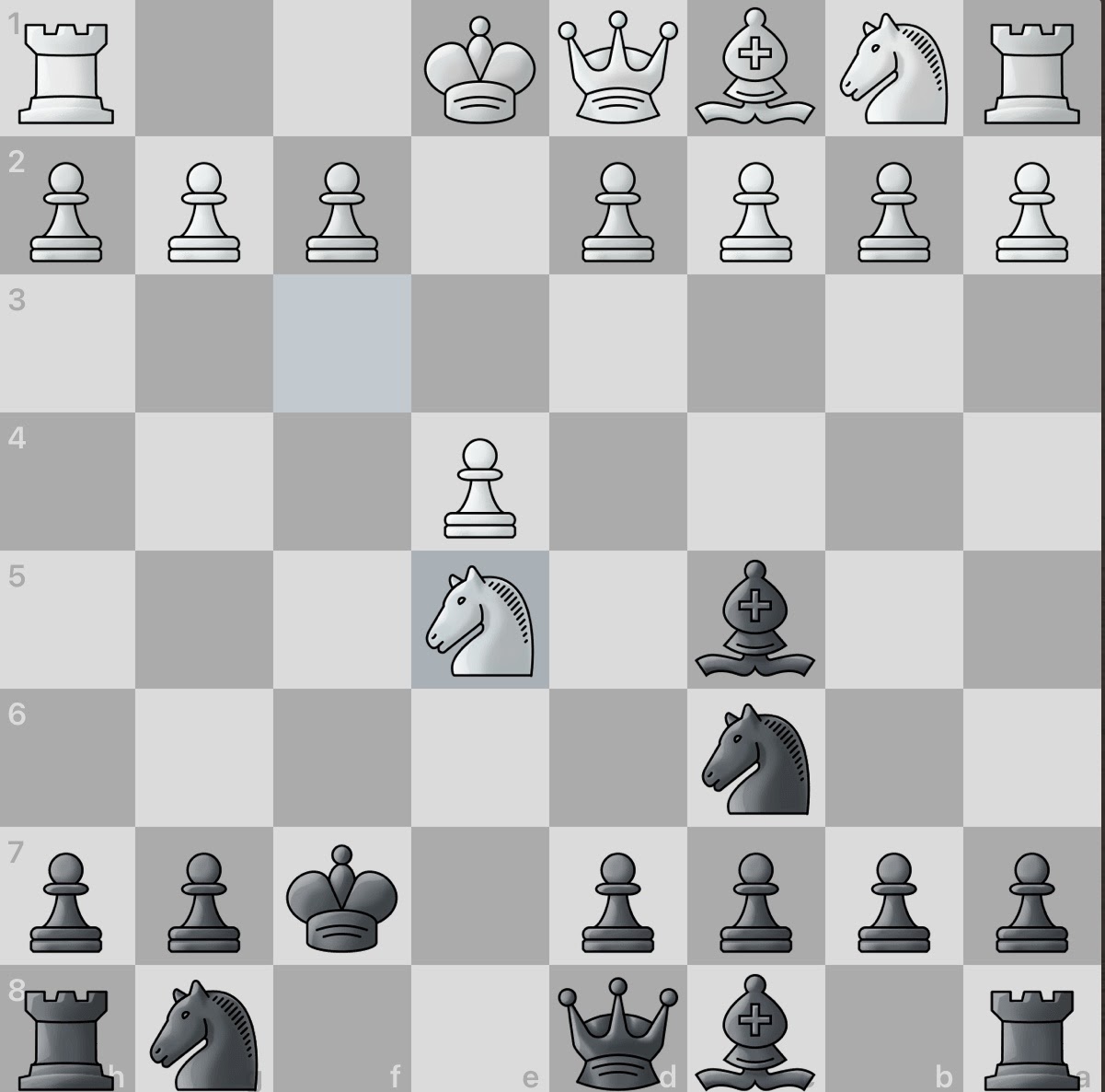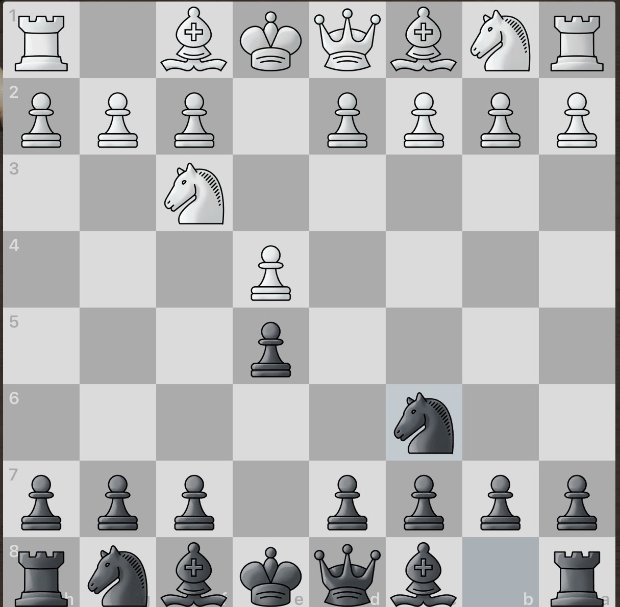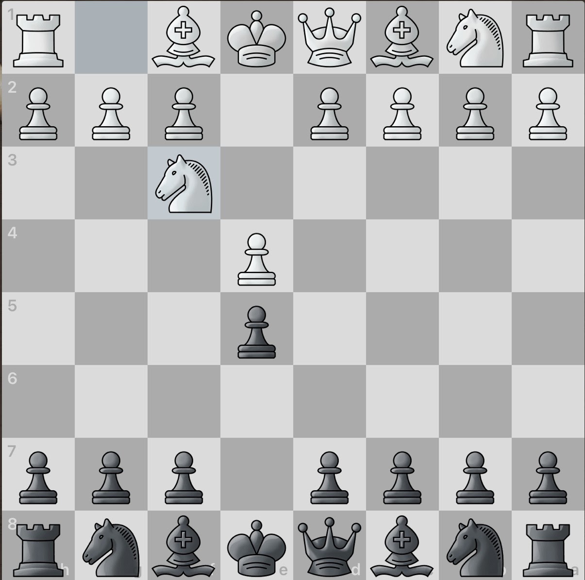 The white knight threatens the e5 pawn. The black knight is eagerly thrown into action to protect said pawn. Play is still largely symmetrical.
