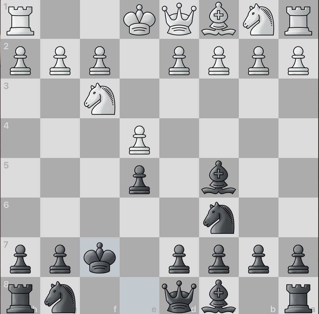 The wry white king returns to safety by castling with the rook next to it. In response, black, worn out and sleepy, develops a knight in hopes to one day — just maybe — launch an attack on the white king.