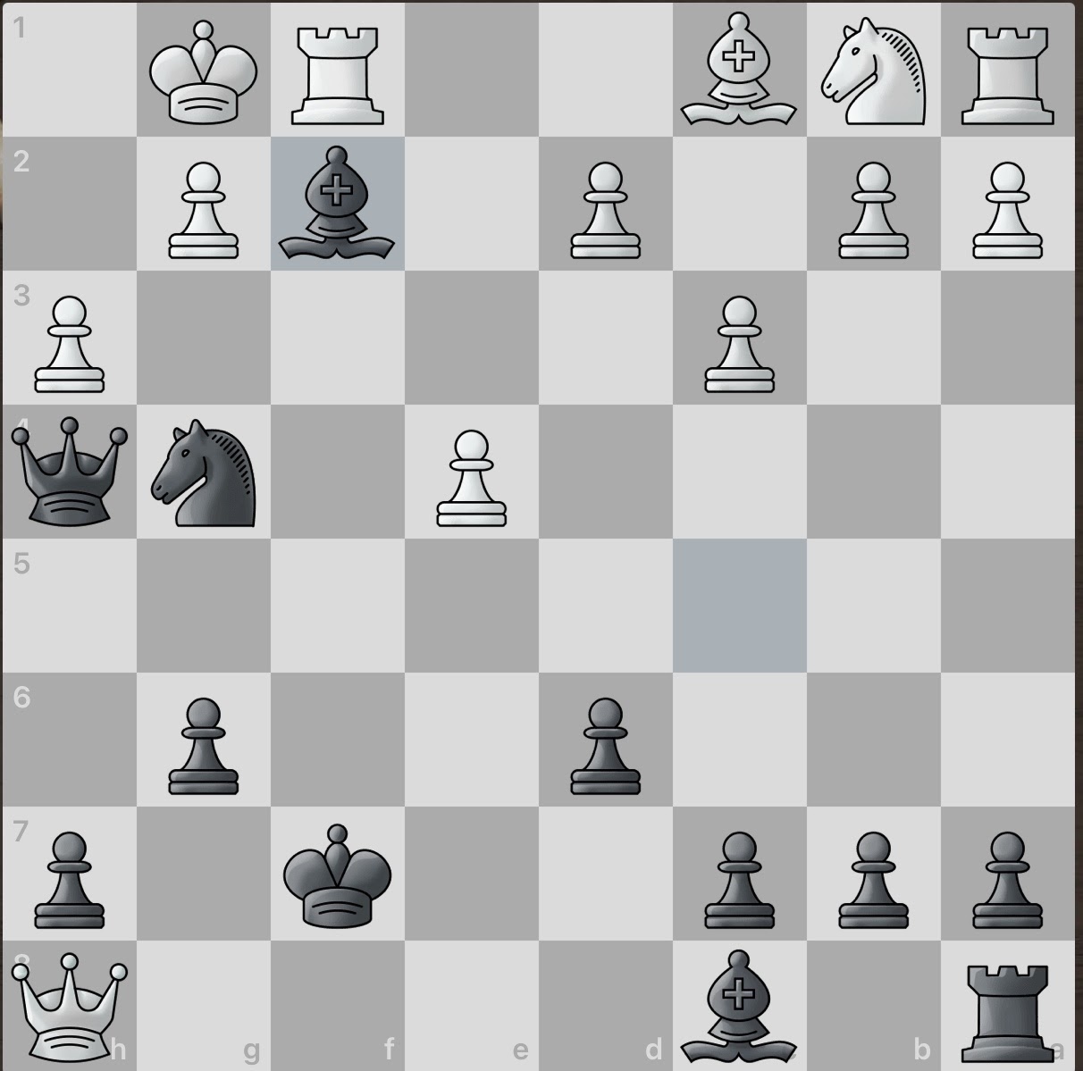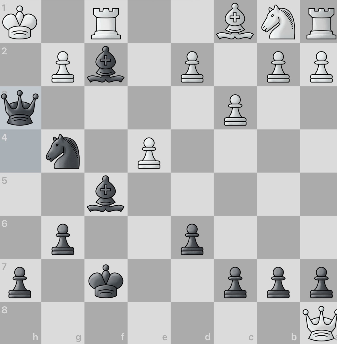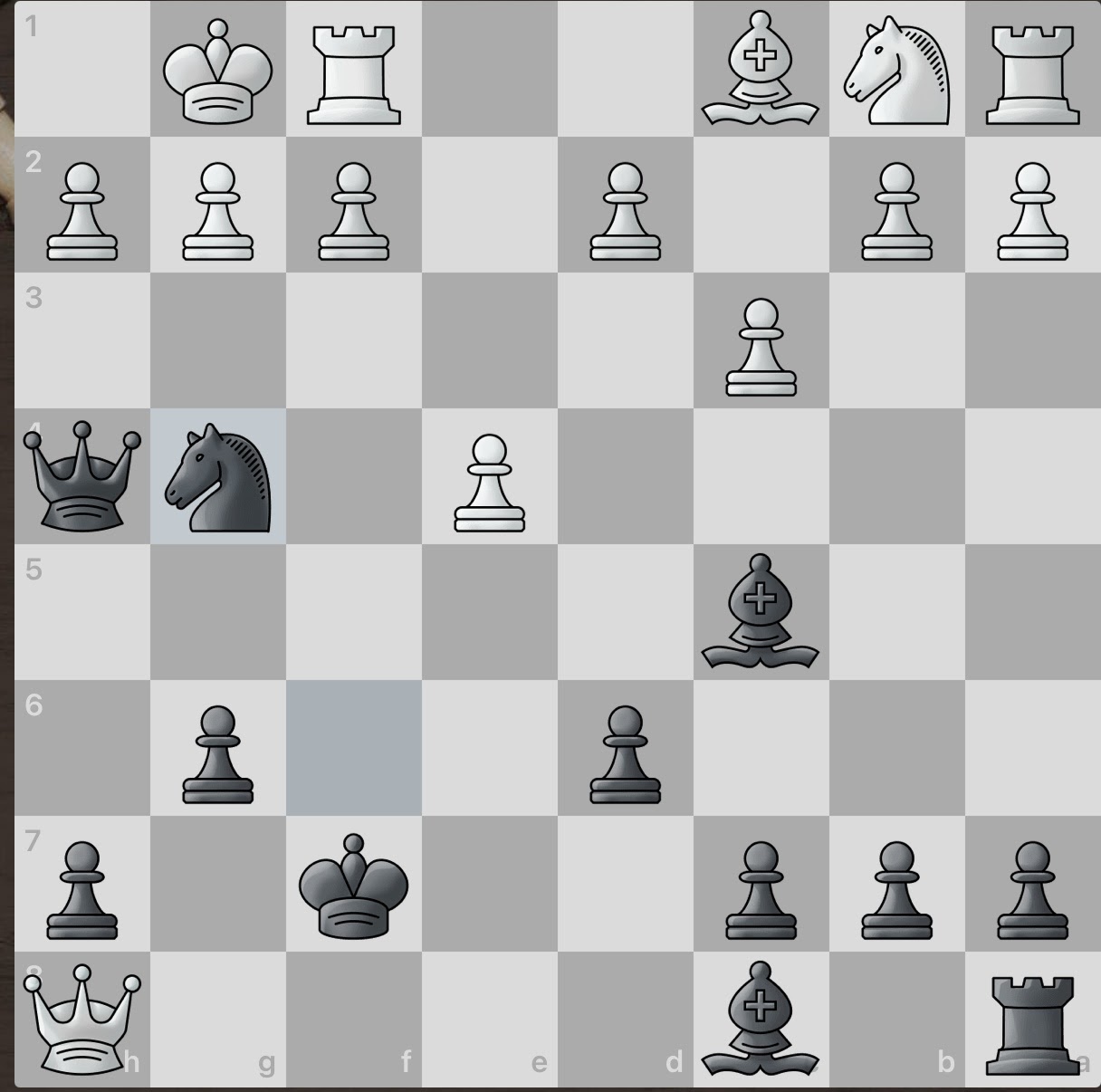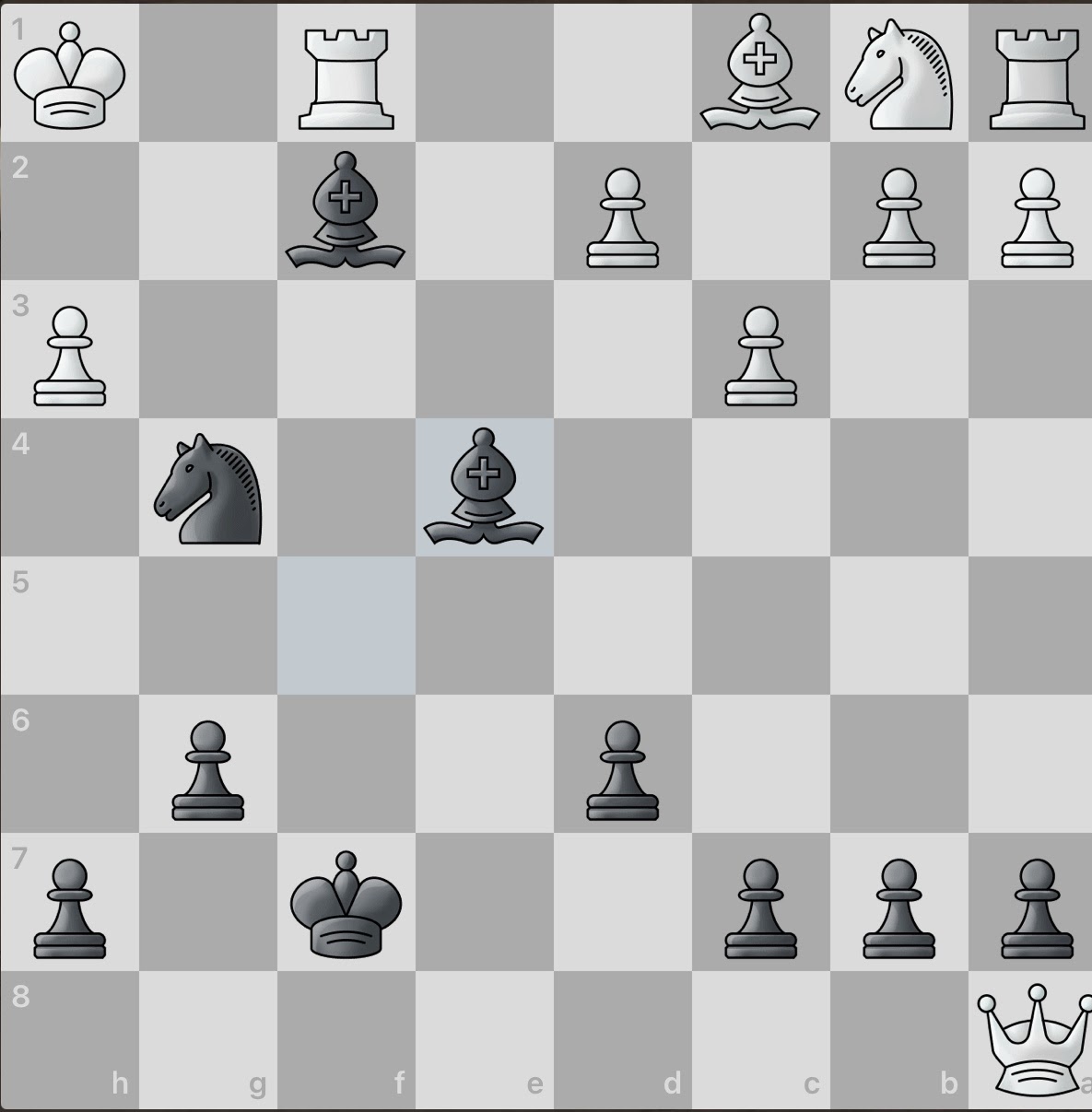 White again sacrifices a piece! However, this gives black an even larger material advantage and consequently, number of active pieces. And even better, white seemingly has no obvious counter attacks. Surely this game will be an easy win for black.