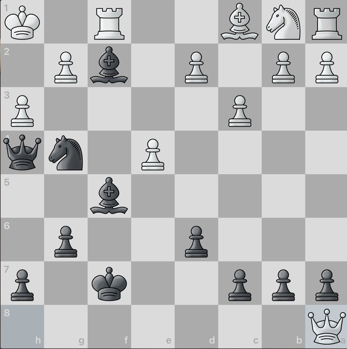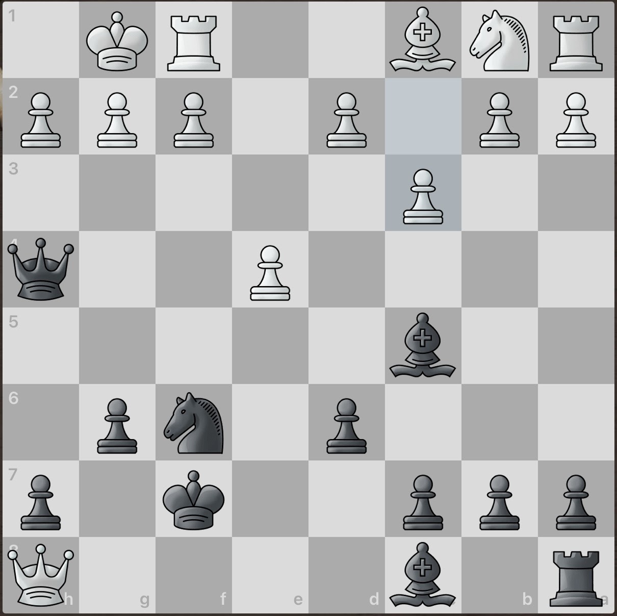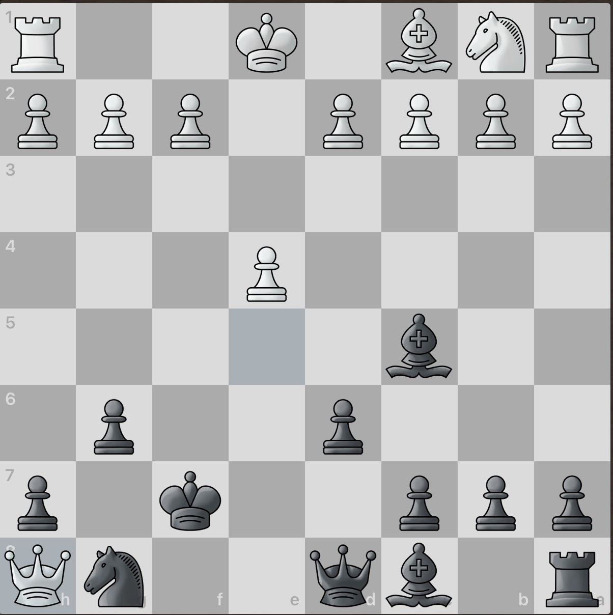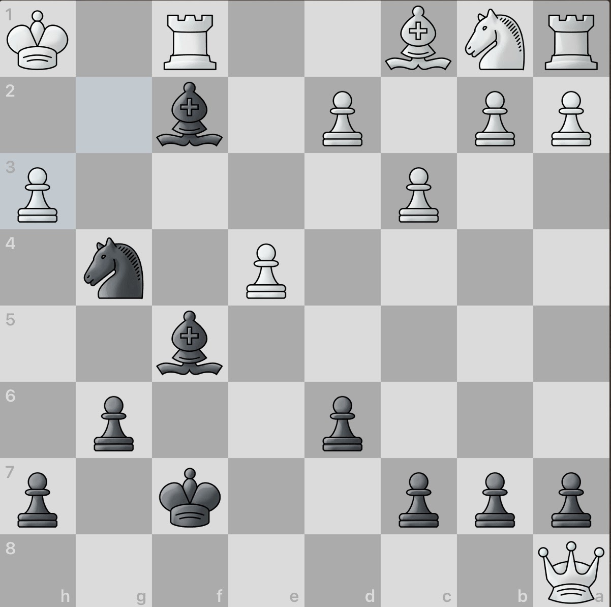 White again sacrifices a piece! However, this gives black an even larger material advantage and consequently, number of active pieces. And even better, white seemingly has no obvious counter attacks. Surely this game will be an easy win for black.