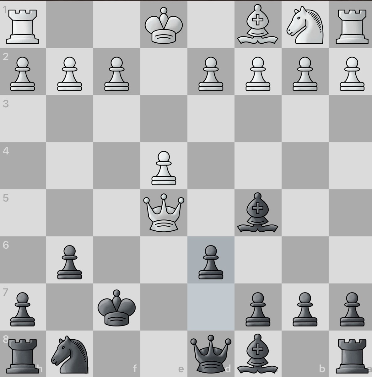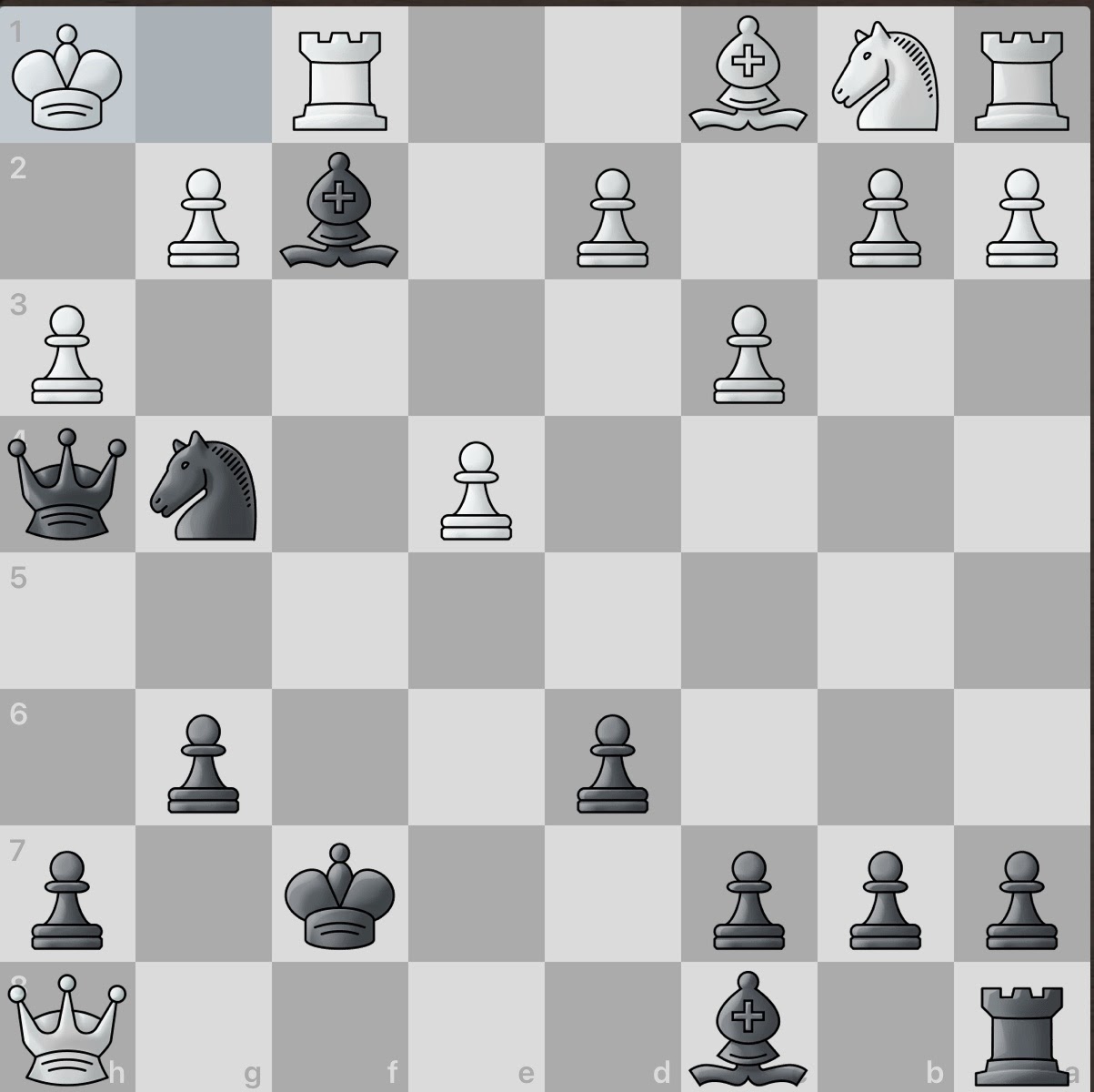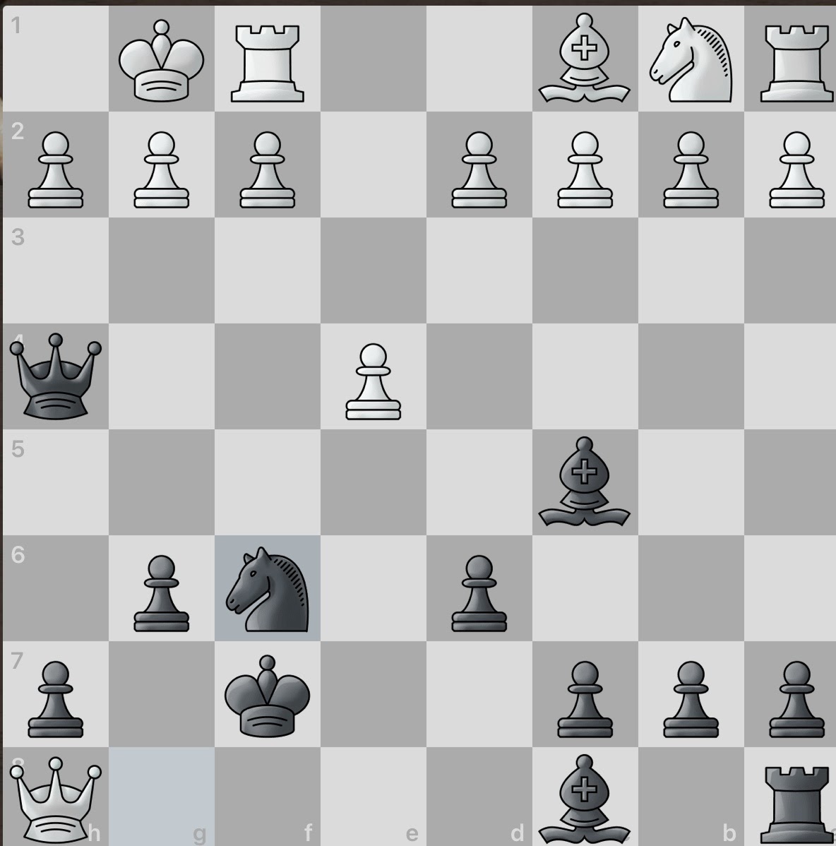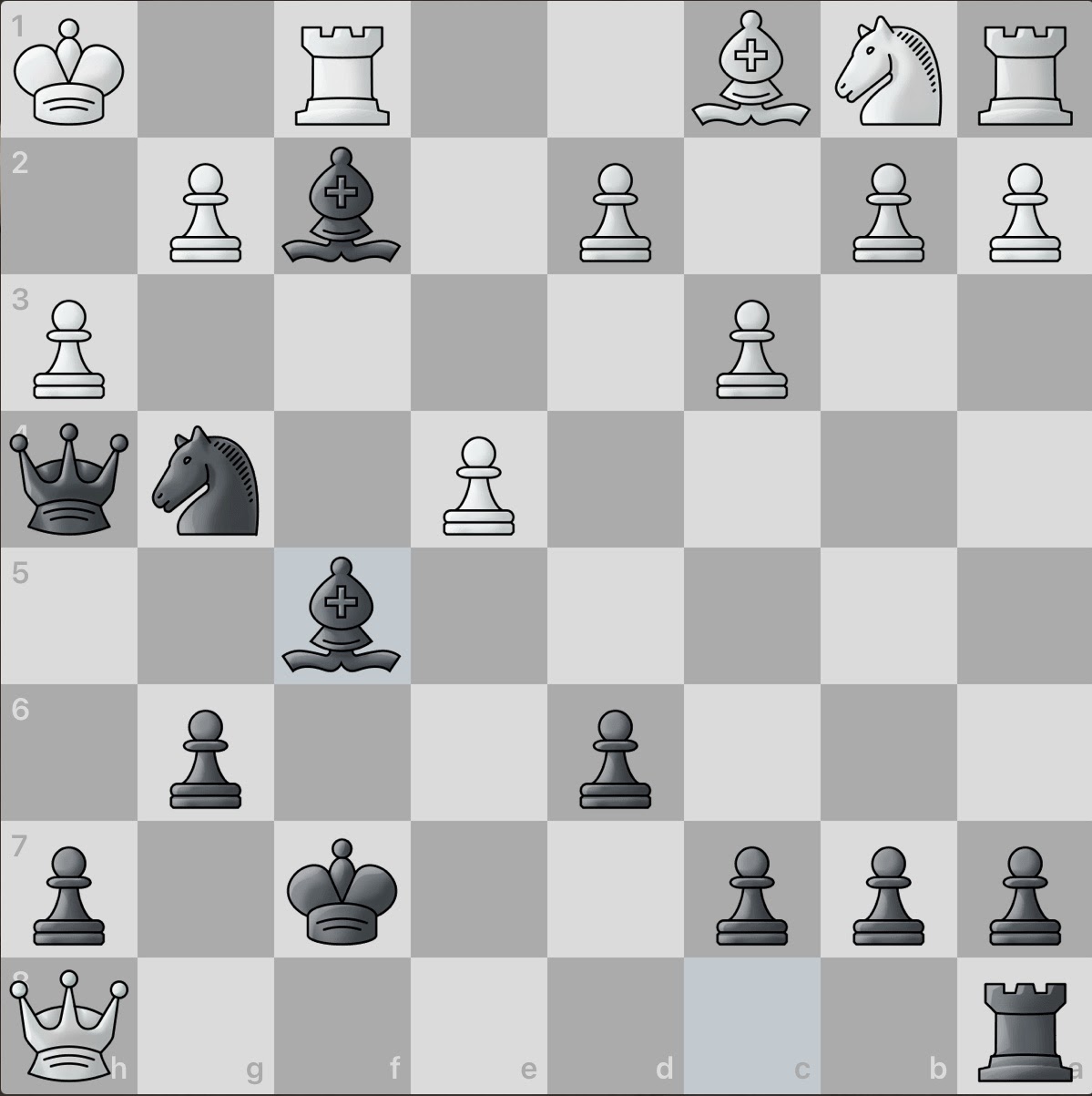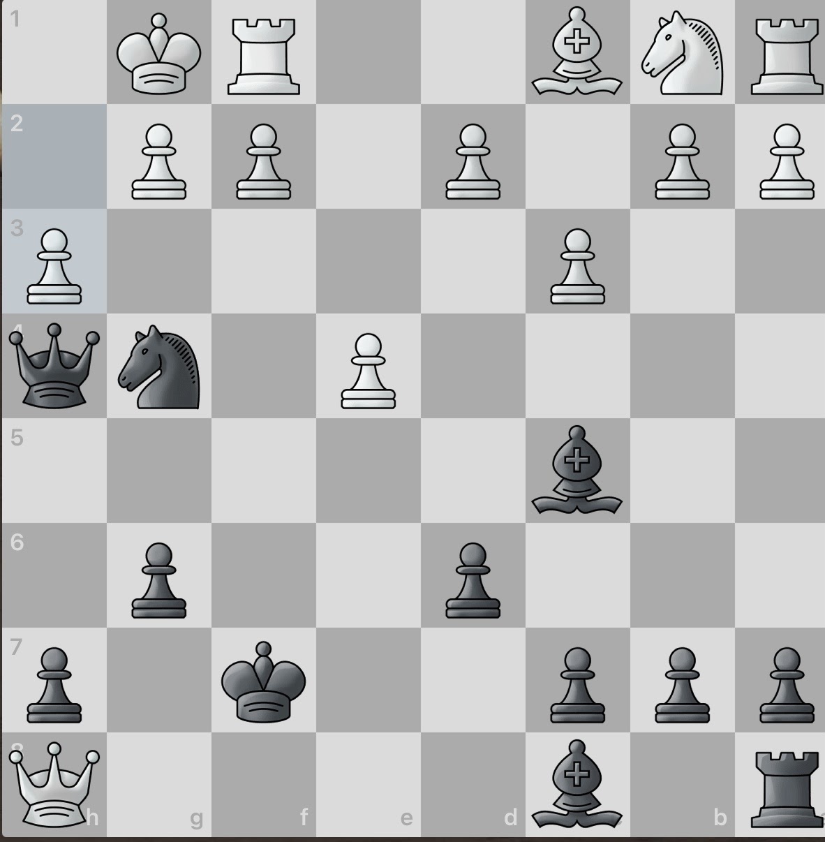 White again sacrifices a piece! However, this gives black an even larger material advantage and consequently, number of active pieces. And even better, white seemingly has no obvious counter attacks. Surely this game will be an easy win for black.