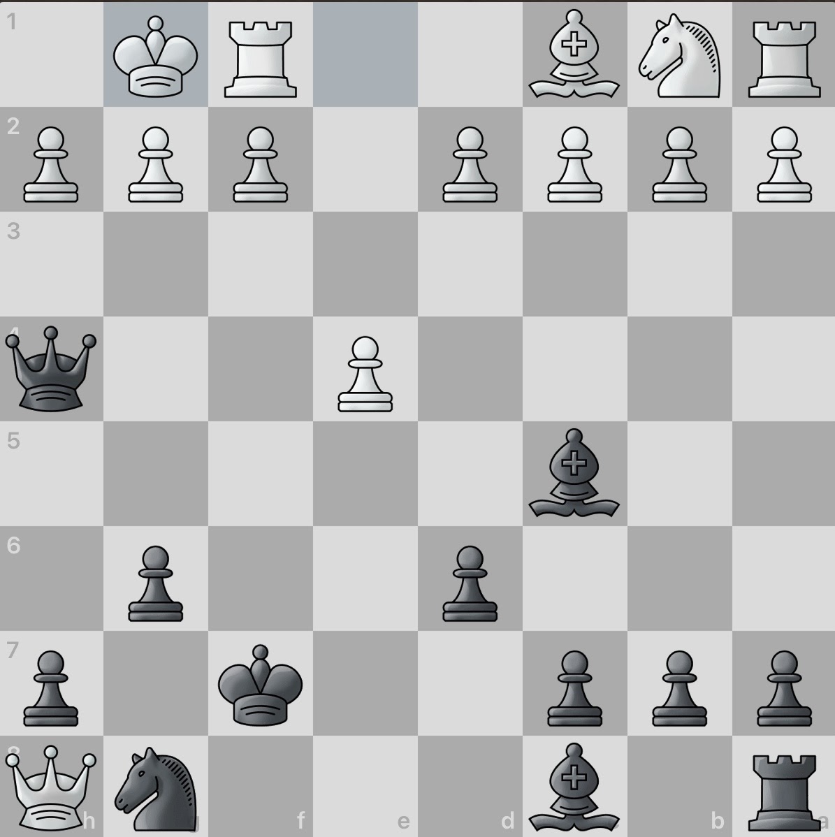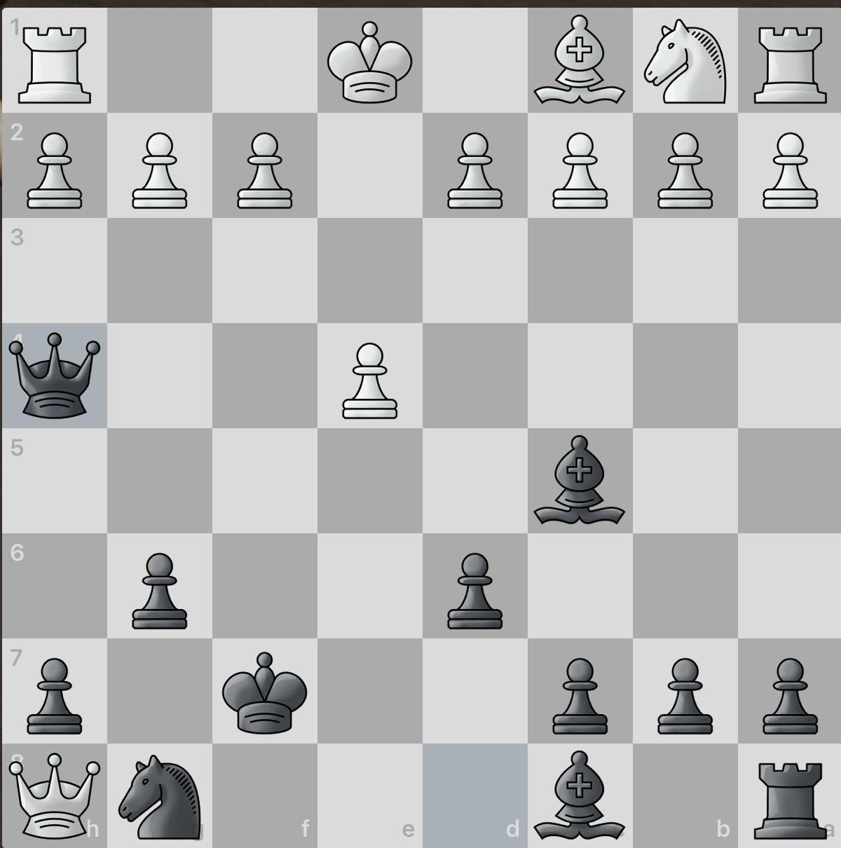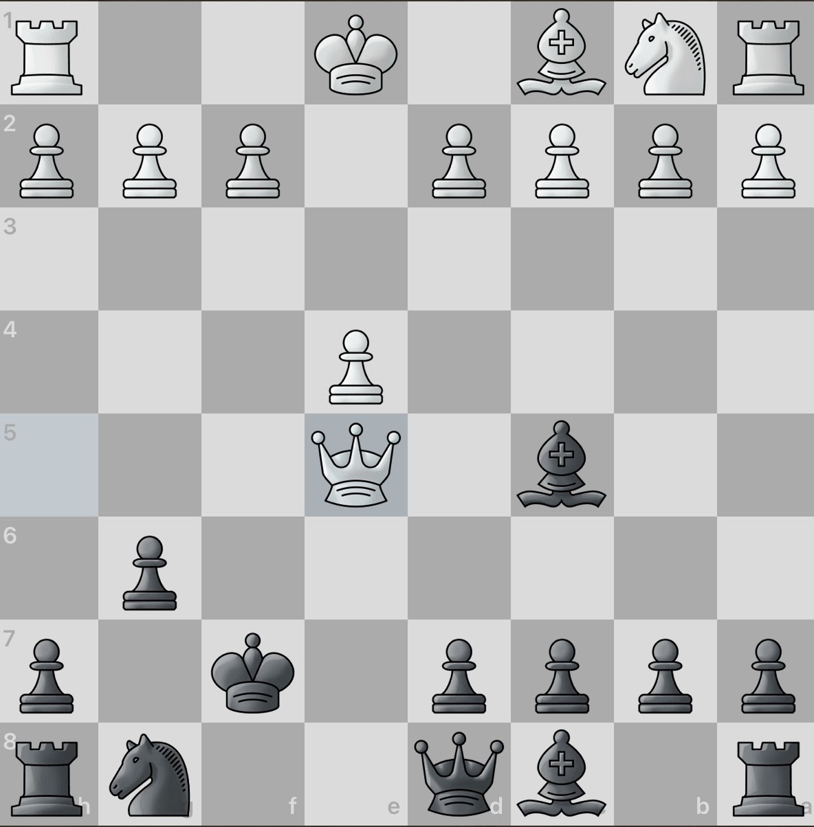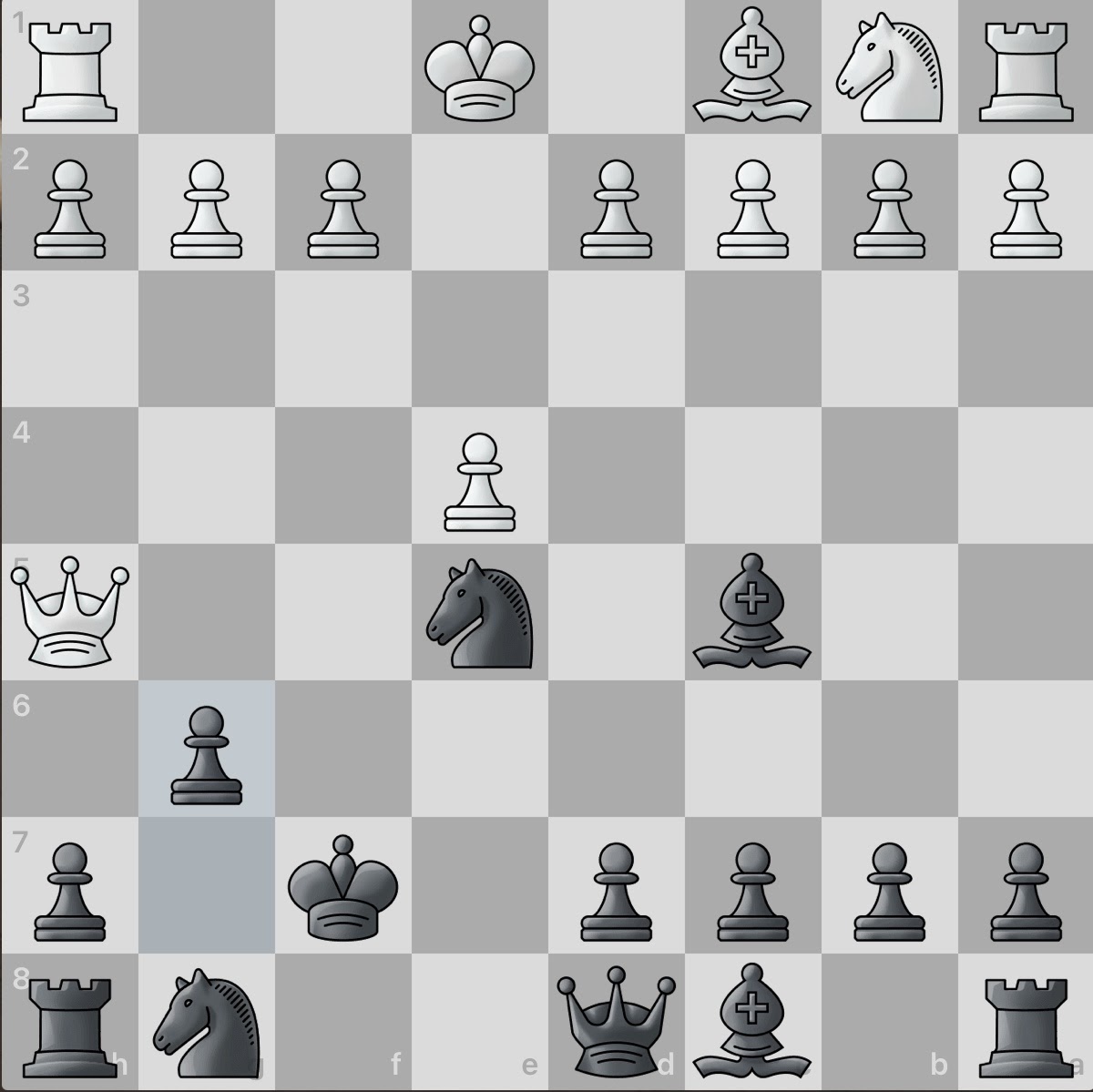 White again sacrifices a piece! However, this gives black an even larger material advantage and consequently, number of active pieces. And even better, white seemingly has no obvious counter attacks. Surely this game will be an easy win for black.