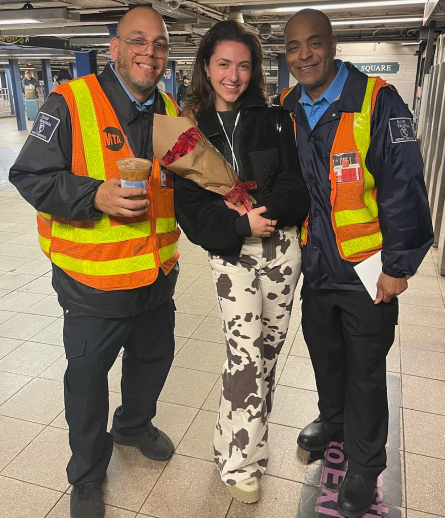 Young woman posing with NYC Metro security guard friends who have given her flowers for her birthday, image from Yahoo